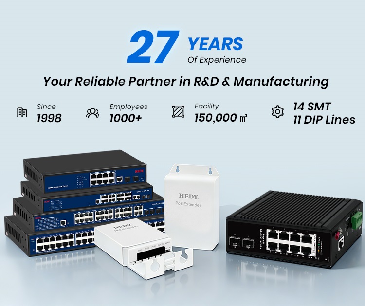 Guangzhou HEAD Technology Development Co., Ltd. is a subsidiary of HEDY Group that specializes in the operation of network communication products (HEDY-Networking). We focus on the research and development, manufacturing and sales of network switches with a comprehensive product portfolio, covering Ethernet Switch, PoE Switch, Industrial Grade Switch, PoE Accessory and customized switch solutions. Our factory has passed the ISO9001 2015 Quality Management Certification, ISO14001 2015 Environment Management Certification and ISO45001 2018 Occupational Health and Safety Certification, and our product covers the certificates of CE, EMC, RoHS, LVD, UKCA, CB, TUV MARK, BIS, FCC, ISED, LOA, C-TICK, RCM, IEC etc.